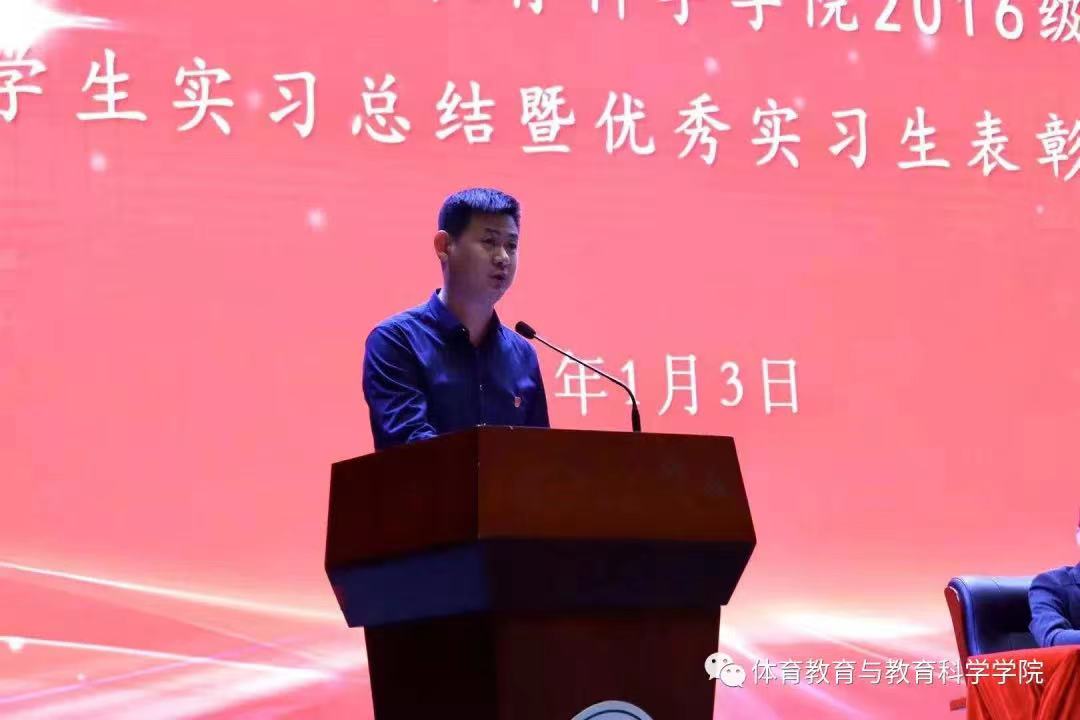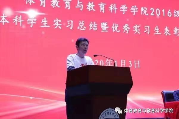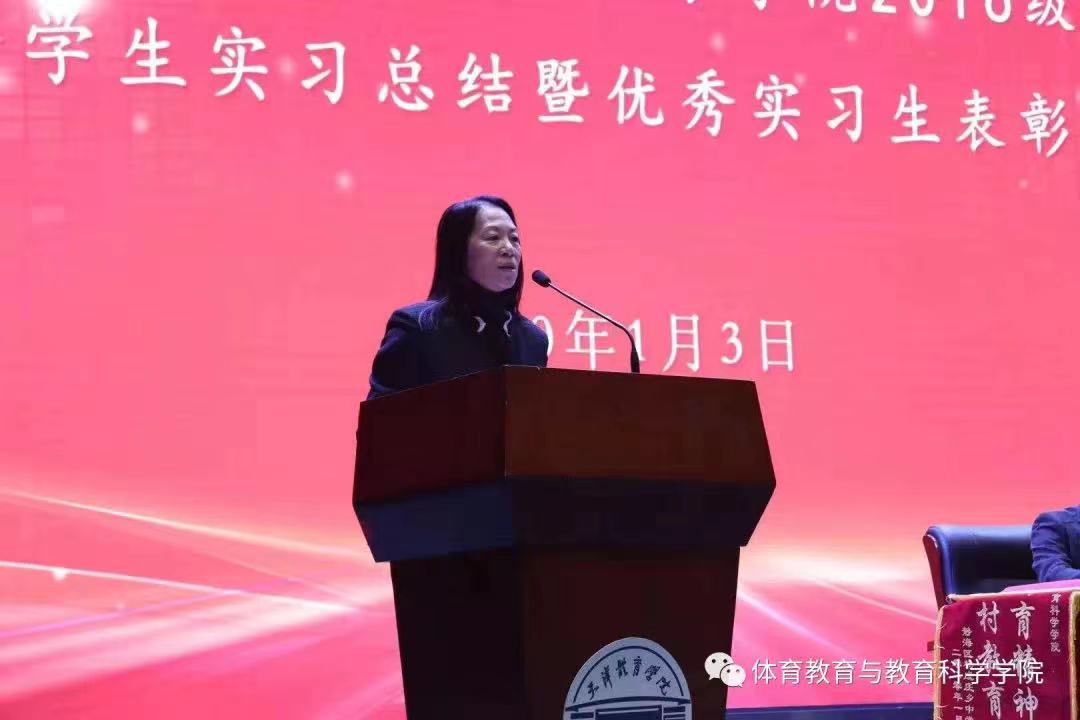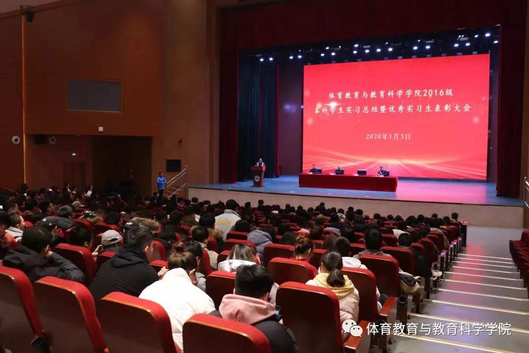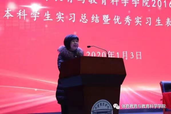 2020年1月3日,体育教育与教育科学学院2016级本科学生实习总结暨优秀实习生表彰大会在大学生活动中心报告厅举行。体育教育与教育科学学院党委书记马桂霞、副书记刘泽林、副院长张运亮、静海区杨成庄中学副校长信岗、各专业建设负责人、实习指导教师、教学秘书、辅导员、2016级本科学生参加此次会议。会议由王佃娥主持。