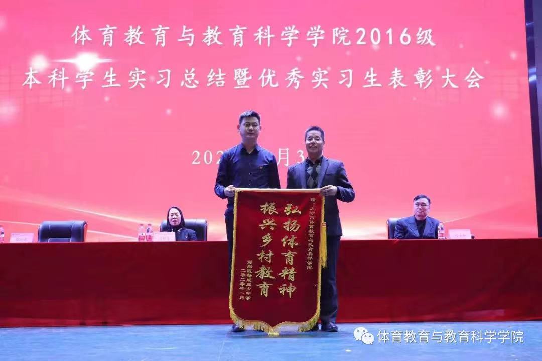 实习单位代表信岗副校长,在回顾学校、学院对其进行精准帮扶的同时,讲述了实习生的工作历程、事迹及取得的成绩,为表达对学院班子、老师的感谢之情,信副校长为学院当场献上锦旗。