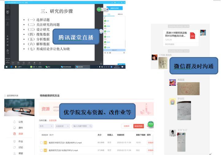 1.采用多个平台协助开展教学,取长补短。在进行直播时,使用速度较快、功能简洁的“腾讯课堂”软件,让偏远地区信号不好的同学也能流畅使用;发放学习资料、发布作业、修改作业时,使用优学院平台,每个同学可以根据自己的时间灵活安排;需要及时沟通、讲课时临时发布资源、上传图片、个别辅导时使用微信或者微信群,以保证时效性。