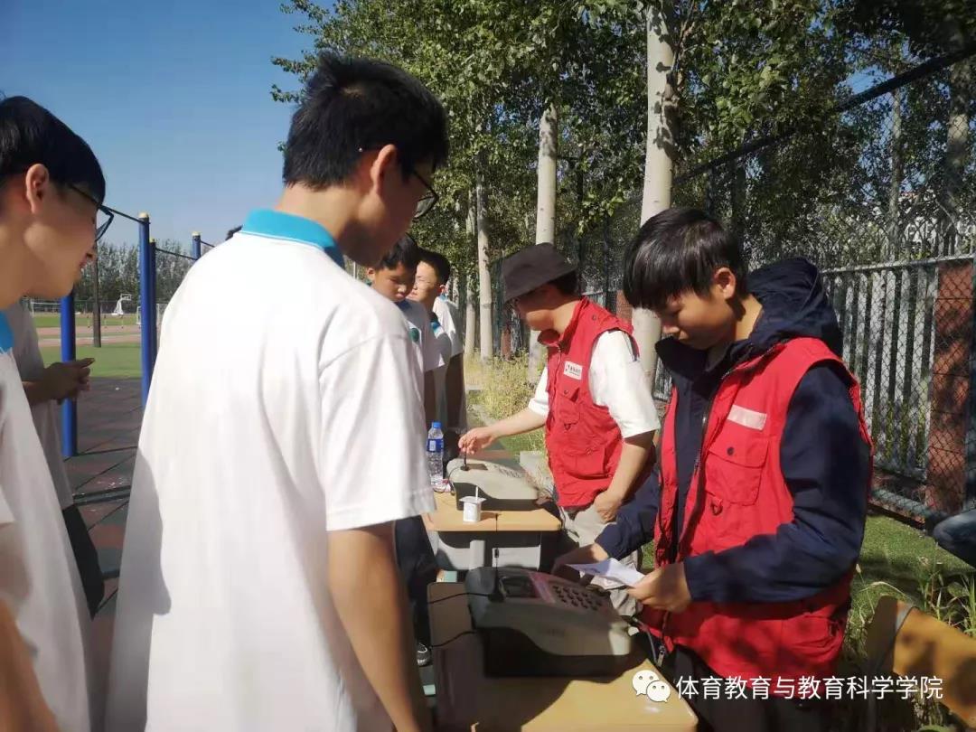 9月23日,各小组负责人带领大家在规定考点为学生进行体质检测,持续曝晒在太阳下的检测员们忍受阳光的直射,保持耐心与热情,顺利完成检测任务。