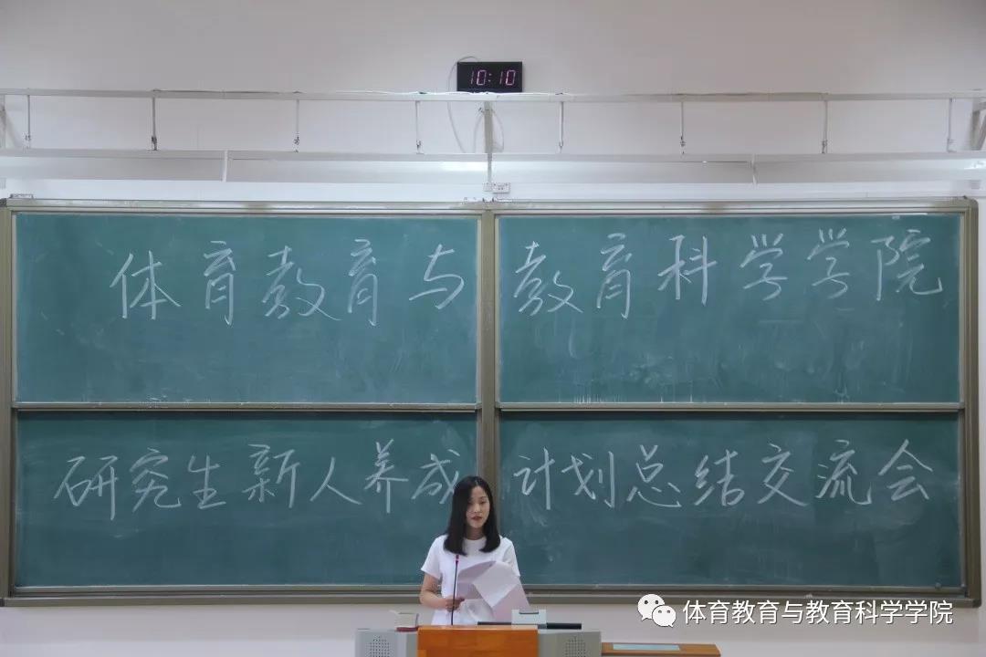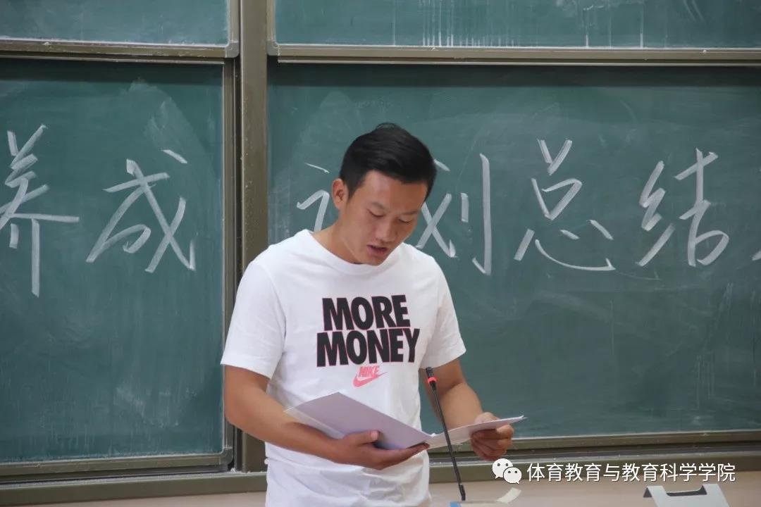 会议开始,由2019级研究生辅导员孙志文汇报体育教育与教育科学学院研究生新人养成计划成果,主要从军训、体质检测实践及师生共建活动等方面对新生养成计划做了精彩总结。