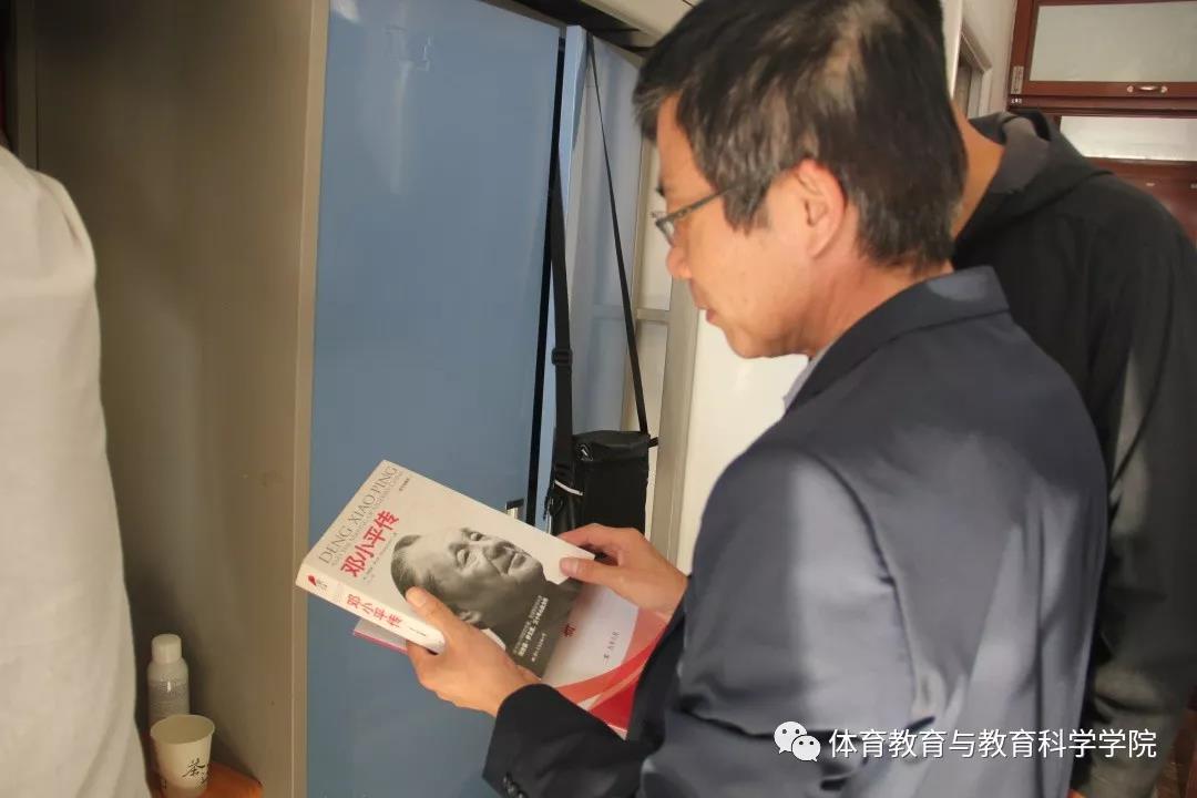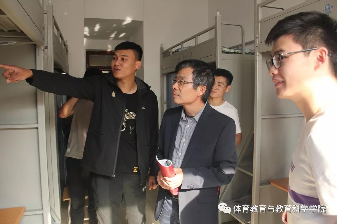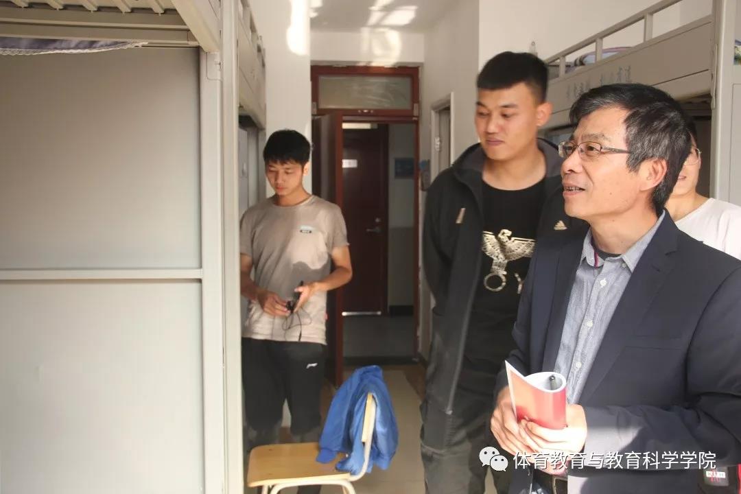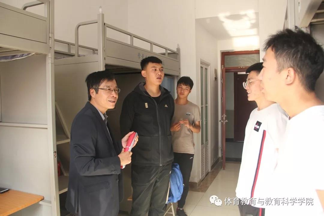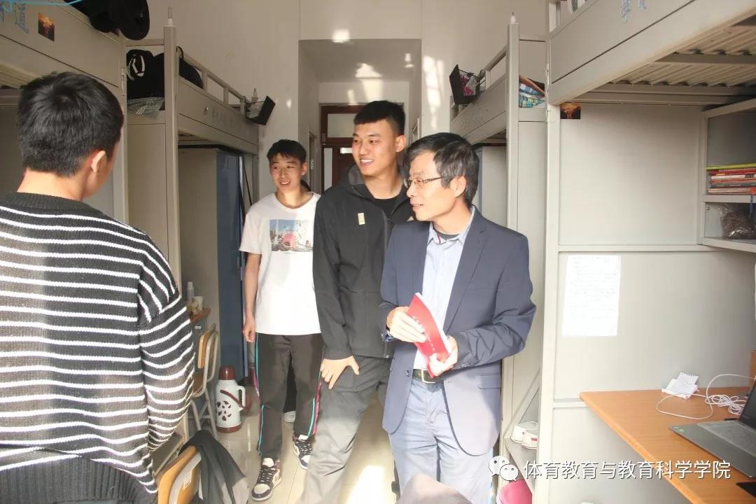 2019年11月12日体育教育与教育科学学院院长孙延林带领研究生辅导员张粲、孙志文、学生干部深入到学生宿舍进行沟通交流。进入学生宿舍后,孙院长亲切地询问学生的一些基本情况,对新环境是否习惯,有些什么困难,对同学们提出的一些问题进行了耐心解答。鼓励同学加强互动交流,尽快融入研究生生活,同时叮嘱同学们在学习和生活上继续以高标准严格要求自己,树立远大理想,多学多看,扩大自己的学术视野,希望舍友之间团结友爱、一起学习、一起进步,共创和谐文明宿舍。