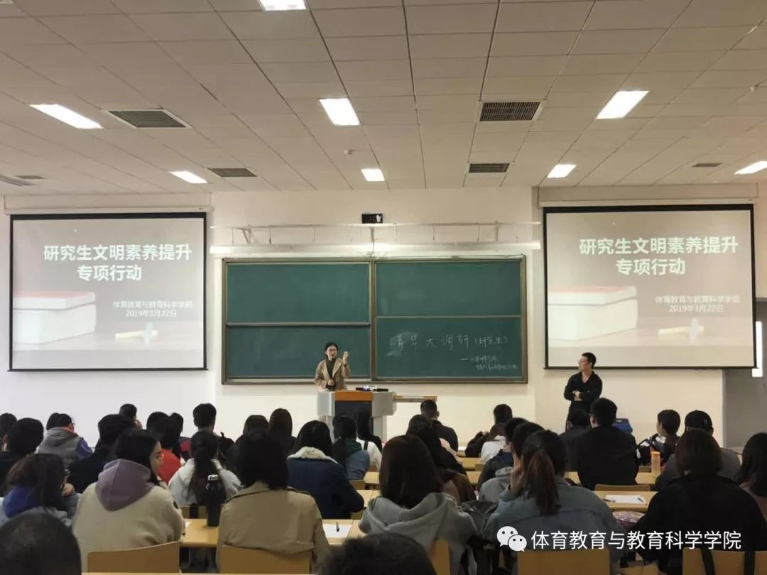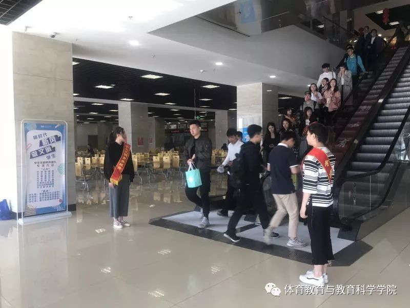 作为学校文明素养提升活动的一部分,在充分学习前期活动开展经验的基础上,体育教育与教育科学学院2018级研究生开展学生文明素养提升系列活动。2019年5月6日至5月10日,由研究生辅导员张粲、孙志文带队,组建一支思想觉悟高、素质修养高、工作水平高的志愿者队伍作为文明先锋,在食堂、教学楼开展文明劝导志愿服务活动,营造除陋习、讲文明的良好氛围,大力宣传倡导“八不”、“四讲”。