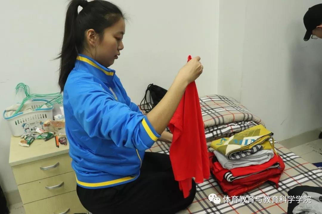 游泳队教练热情的接待了同学们,为同学们介绍了运动员平时的训练及在队里的生活情况,让同学们更直观的感受到了运动员们的艰辛付出,大家都发自内心的希望为他们做些力所能及的事情,同学们在宿舍区域一起帮助运动员们叠被子、整理衣服和生活用品。曾竹心同学还为一位头部受伤的运动员换药并与运动员进行了交流。