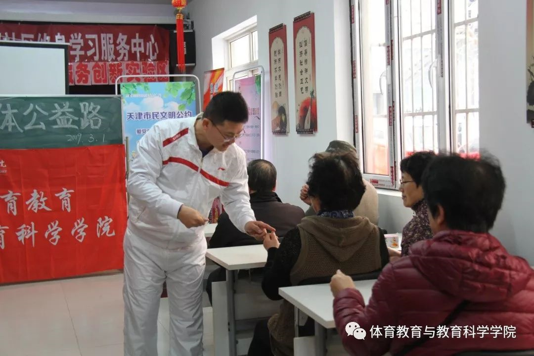 2019年3月1日体育教育与教育科学学院七名学生携四名马来西亚同学走进社区,面向社区的中老年人展开健康科普宣传,传授健康的饮食搭配及正确的锻炼方式等,将在课堂中所学到的知识运用于实践当中,及时为社区居民提供他们切实需要的、精准化、精细化服务。
