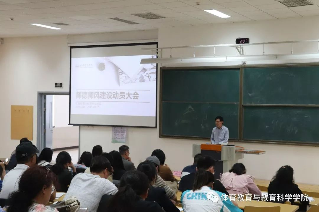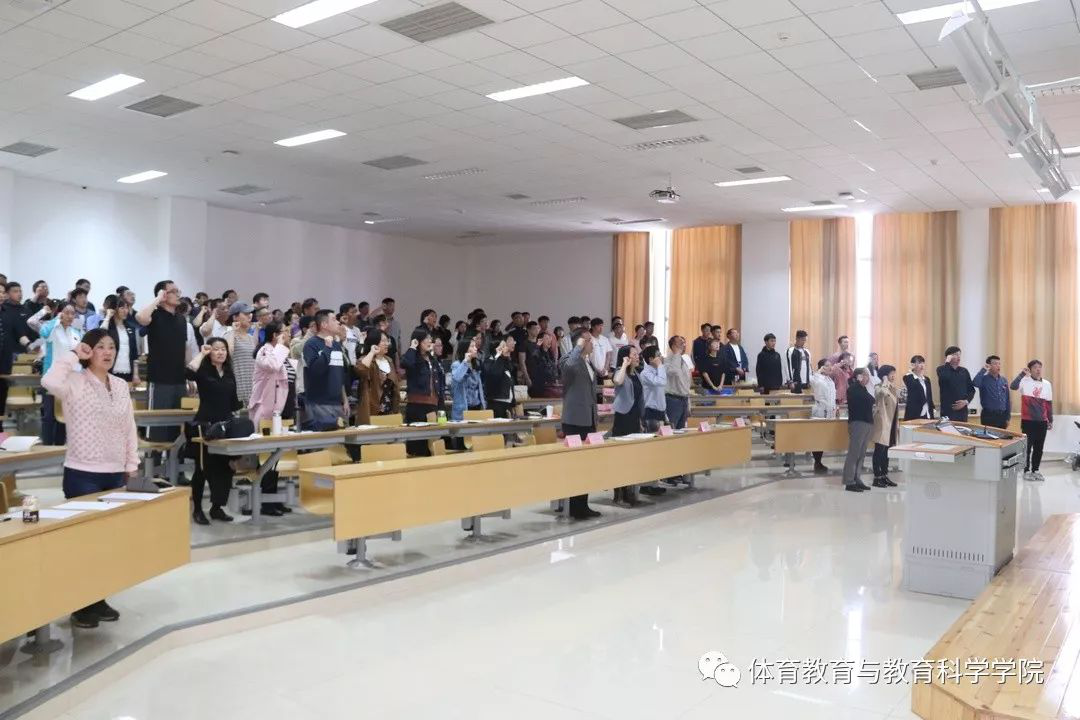 5月5日中午13时,体育教育与教育科学学院全体教师在教学楼A201召开师德师风建设誓师动员大会,对师德师风建设的活动进行任务布置、签署师德承诺书和宣誓。会议由院长孙延林主持,学院领导班子成员,办公室成员、辅导员、全体教师和部分优秀学生代表参加。