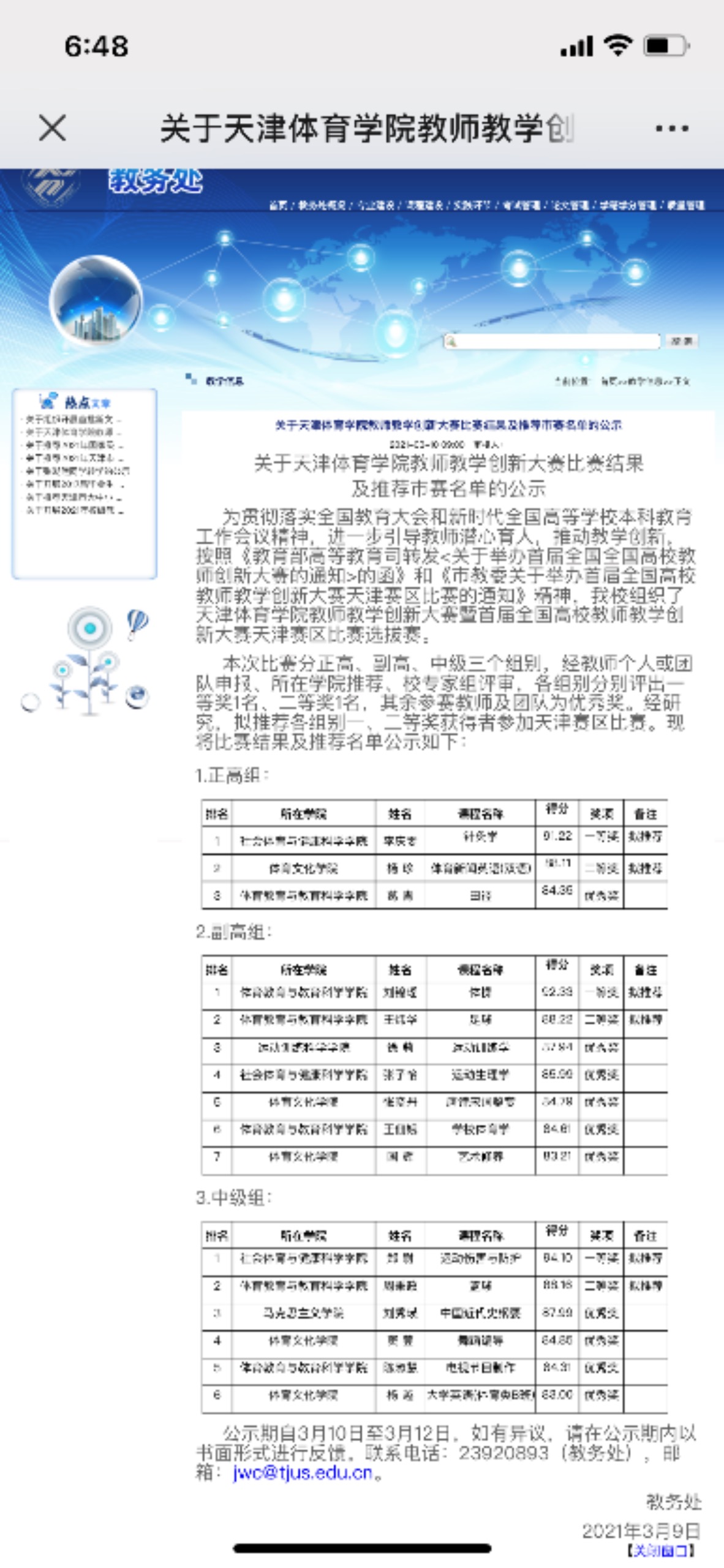 近年来,在学校以及学院的支持下,由体操武术教研室组织举办的《体操》“课程思政”创新改革成果汇报展示暨体育教育专业学生技能提升竞赛,以“青春律动新时代,融道于术追梦人”为赛事主题,赛程分别以“榜样的力量”---青年教师展示体操技能,使学生具有学习的目标及前进的动力;“拼搏的舞台”---激发参赛学生在比赛中展现“相互理解、友谊长久、团结一致和公平竞争”的奥林匹克精神;“无上的荣耀”---在获奖学生颁奖的环节中激励学生要有勇攀高峰、挑战自我的意志品质。